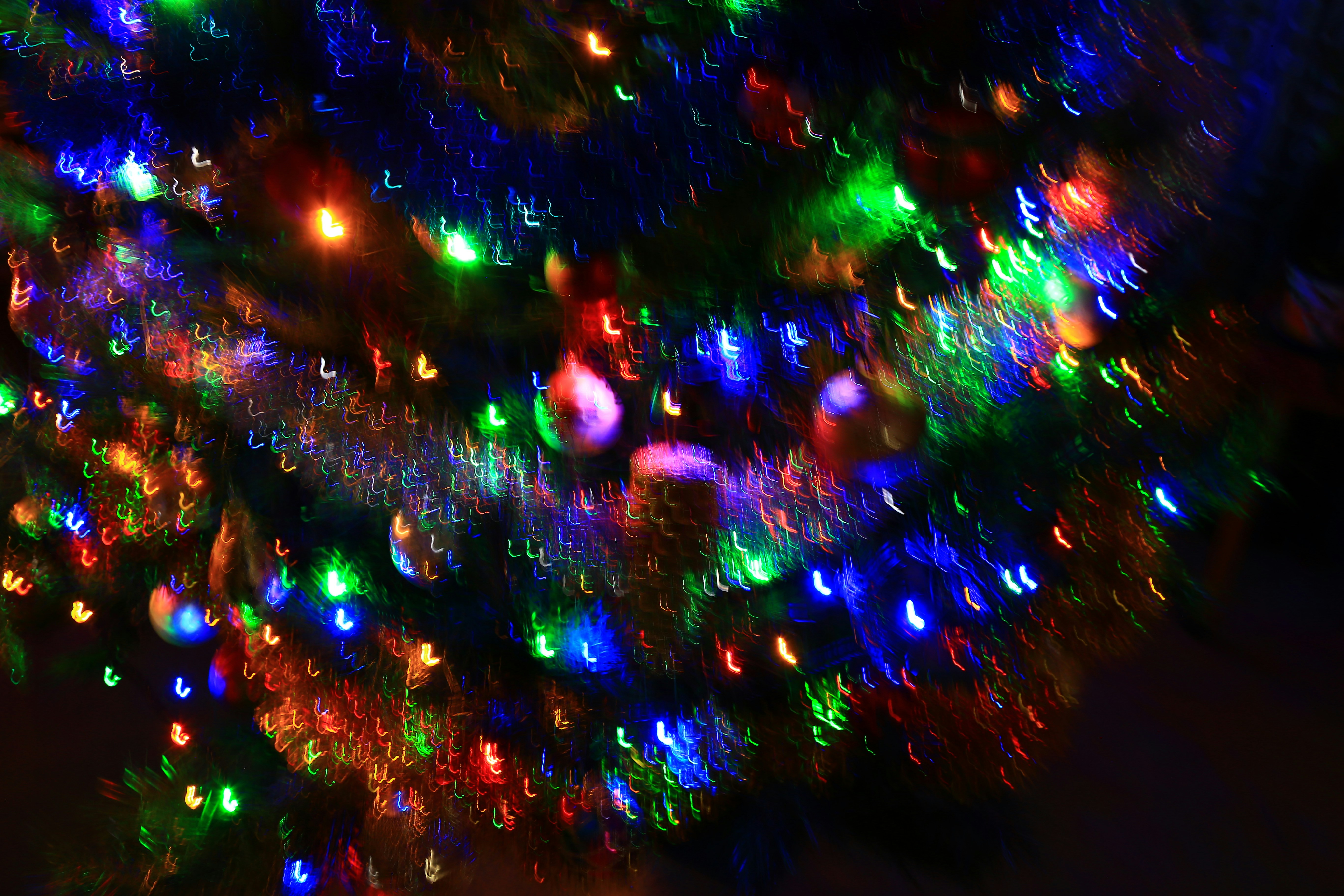 A festive Christmas tree decorated with traditional multicolor lights in blue, green, red, and orange, creating a vibrant and colorful holiday display with a glowing, slightly blurred effect.